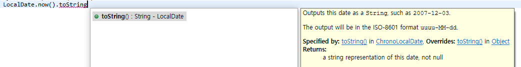 일자를 표현하는 클래스인 LocalDate가 toString을 잘 재정의한 사례이다. 먼저 일자의 핵심정보인 년/월/일이 모두 출력된다. 그리고 메소드에 주석을 적절히 달아두어서 "2022-08-31"과 같은 형식으로 출력된다는 것 또한 개발자가 쉽게 알 수 있다.