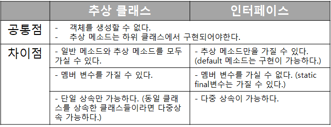 자바에서는 코드의 재사용성을 높이기 위해 공통으로 쓰일 수 있는 내용들을 상속해서 사용하도록 추상 클래스나 인터페이스로 정의할 수 있다. 추상 클래와 인터페이스 모두 상속을 위해 만들어진 것으로 그 자체로 인스턴스를 만들 수 없다. 그리고 추상 클래스나 인터페이스에 존재하는 추상 메소드는 상속/구현하는 하위 클래스에서 구현해야 한다. 이 둘은 비슷한 역할을 하고 있지만 차이점도 존재한다. 먼저 추상 클래스는 일반 메소드도 가질 수 있고 멤버 변수도 가질 수 있다. 하지만 단일 추상클래스만을 상속 시킬 수 있다. 인터페이스는 추상 메소드만을 가져야하고 멤버변수를 가질 수 없지만 다중상속을 시킬 수 있다.