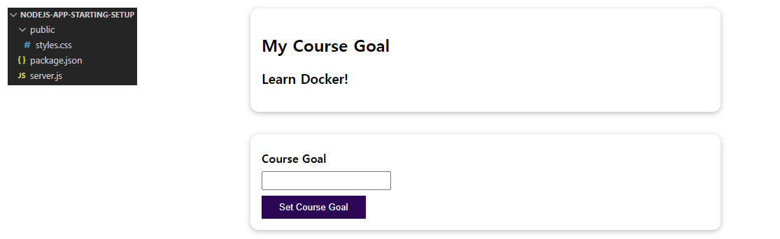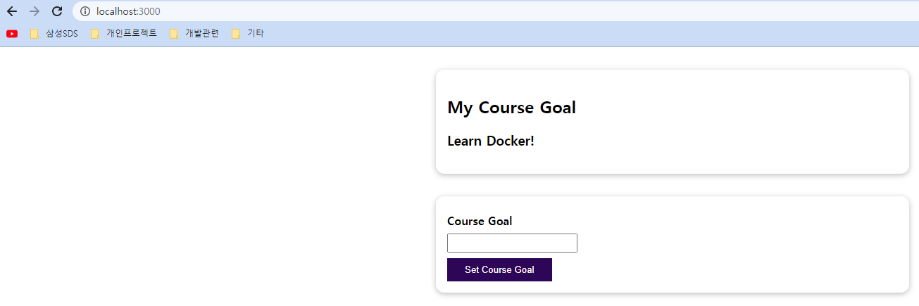 localhost:3000으로 접속해보면 여전히 "My Course Goal"으로 문구가 나온다. 이는 도커 컨테이너를 띄우는 과정을 생각해보면 당연한 것이다. 도커 컨테이너를 띄우기 위해서는 제일 먼저 1) 소스파일과 dockerfile을 준비한다. 2) 소스파일과 dockerfile을 빌드하여 도커 이미지를 생성한다. 3) 도커 이미지로 도커 컨테이너를 띄운다. 도커 컨테이너는 도커 이미지로 돌아가고 도커 이미지는 소스파일과 dockerfile의 빌드로 만들어진다. 소스파일인 server.js을 변경하여도 기존 도커 이미지에는 아무런 영향이 없다. 소스 변경내용을 반영하기위해서는 다시 도커 빌드를 수행하여 새로운 이미지를 만들어야 한다.