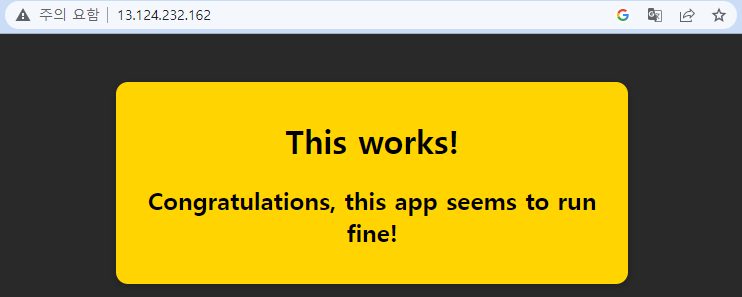 그리고 인스턴스에 접속하여 도커를 설치해주었다. 각 운영체제별 도커 설치 방법은 도커 공식 홈페이지에 자세하게 설명되어있다 (https://docs.docker.com/engine/install/ubuntu/.) 설치가 끝나고 docker run 명령어로 업로드한 이미지를 컨테이너로 실행하면 끝이다. 이제 브라우져에서 EC2 인스턴스IP:80 으로 접속해보면 NodeJS App이 나오는것을 볼 수 있다.