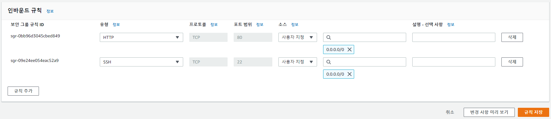 도커 허브에 업로드한 이미지를 가져와서 컨테이너를 실행할 EC2 인스턴스를 생성하였다. 그리고 생성된 인스턴스에 적용되는 보안 그룹을 설정해주었다. 인스턴스에서 실행될 NodeJS App은 80번 포트로 실행이 되므로 80번포트로의 접속을 허용해주었다.