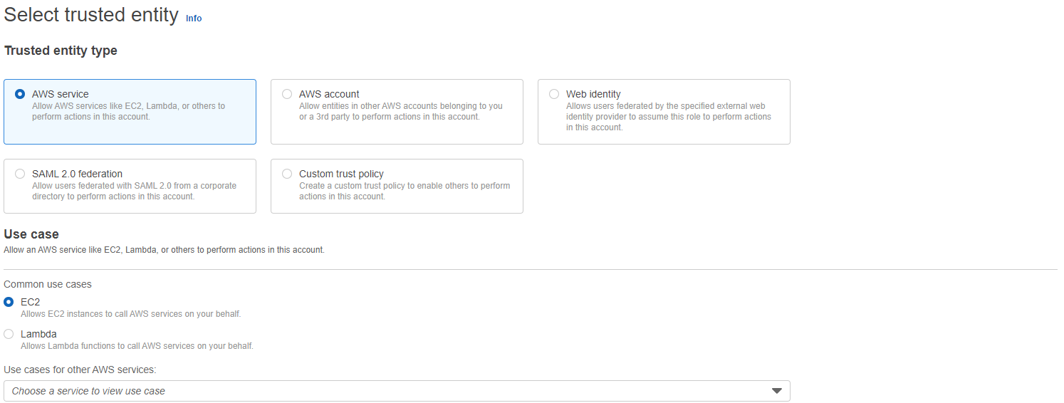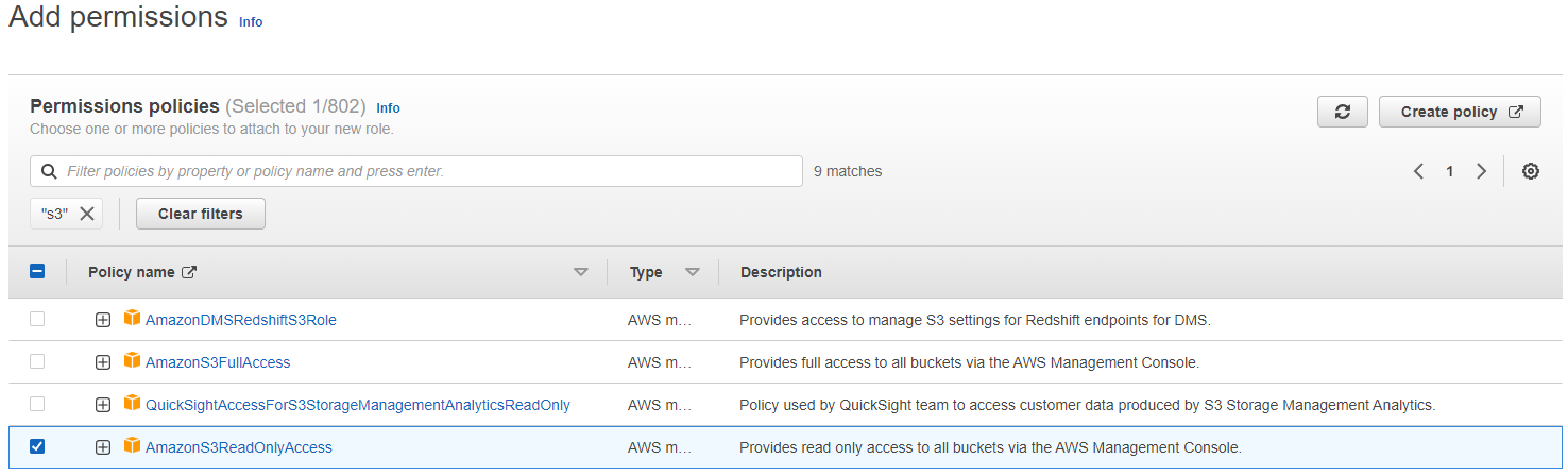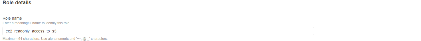 IAM에서 역할은 유저와 유사하게 접근 권한을 가진 객체이다. 하지만 유저가 사람이 사용하기위한 것이라면 역할을 AWS 서비스가 다른 서비스에 접근하기위한 권한을 제어하는데 주로 사용한다. 예를 들어 EC2에서 S3 스토리지에 접근하려면 Lambda에 역할을 부여해야 한다. 아래는 실제 EC2에 S3 스토리지 읽기 전용 권한을 부여하기위한 역할 생성 예시이다.