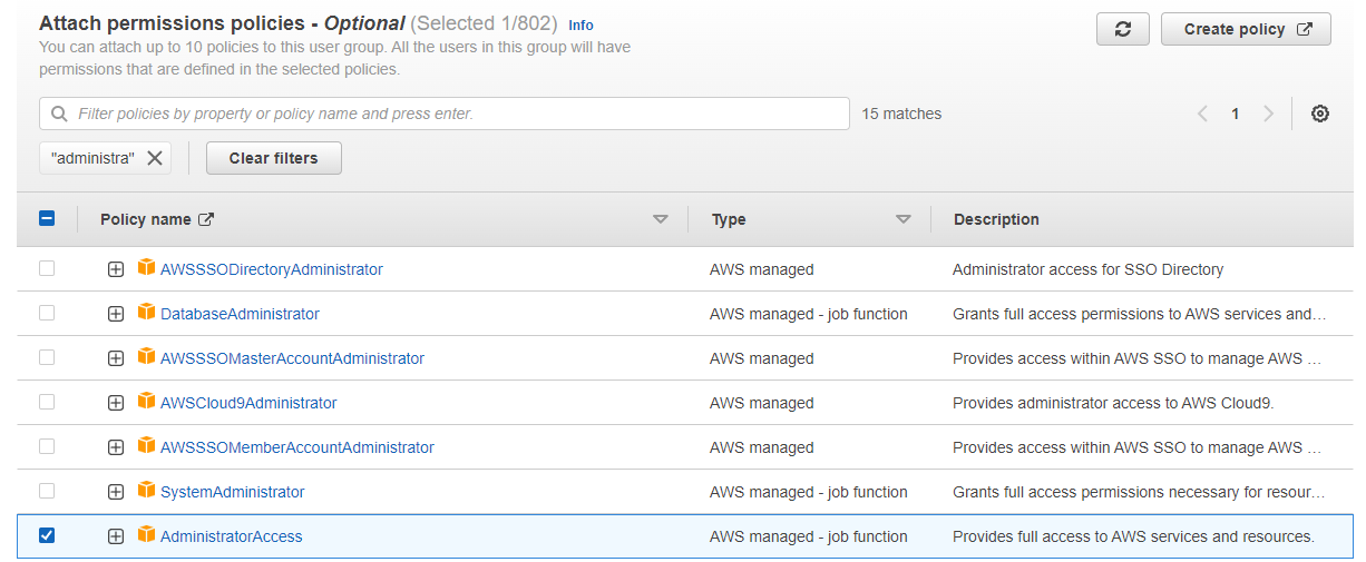admin_group 그룹을 생성하였다. 이 그룹에는 모든 리소스에 접근 가능한 AdministratorAccess 정책을 부여하였다.