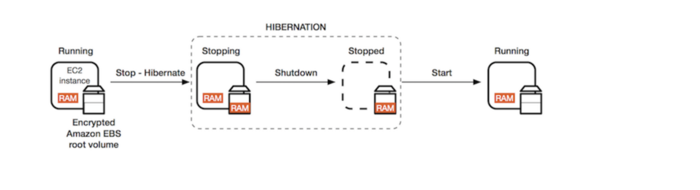 EC2 인스턴스를 정지 후 재시작 하면 실행중에 있던 모든 RAM 정보가 사라지게 된다. 즉 컴퓨터를 새로 시작한 것과 같아진다. 물론 영구 스토리지에 저장한 정보가 사라지지는 않지만 메모리상에 있는 정보는 사라지게 된다. 하지만 EC2 Hibernate 옵션을 적용하면 인스턴스를 중지해도 메모리에 있던 정보가 EBS 스토리지에 저장되어 다시 시작한 이후에 메모리에 그대로 올라가게 된다. 즉 컴퓨터를 중지하지 않았던 상태와 같아진다.