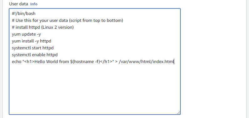 User data는 인스턴스 최초 생성시 딱 한번 실행되는 커맨드라인 명령어이다. 위 커맨드라인은 서버에 기본 웹페이지를 생성하는 명령어이다.