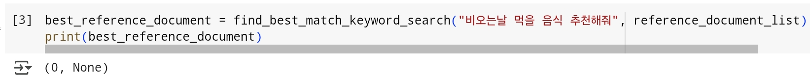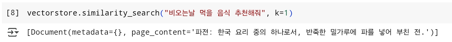 랭체인을 사용해서 OpenAI의 text-embedding-3-small 모델을 적용한 벡터 저장소를 만들었다. 만들어진 벡터저장소를 통해 "비오는날 먹을 음식 추천해줘"라는 문장에 가장 가까운 문서를 찾은 결과, 파전에 대한 문서가 나왔다.