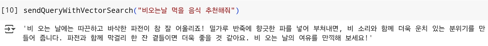 사용자의 쿼리가 왔을 때, 벡터 스토어에서 문서를 검색해서 LLM에 전달하는 메소드를 만들었다. 이제 "비오는날 먹을 음식 추천해줘"라는 질문에 파전 문서를 참조해서 답변하는걸 볼 수 있다.