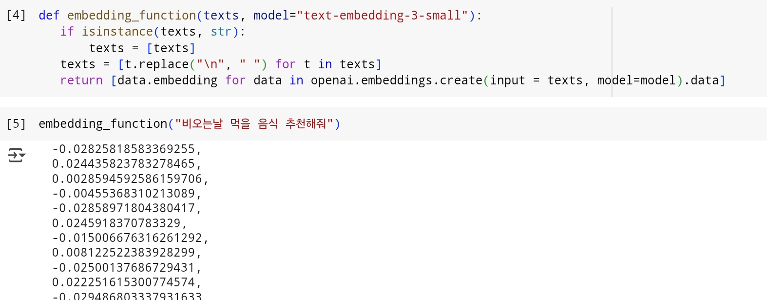 OpenAI에서는 text-embedding-3-small이라는 경량 모델을 제공하고 있습니다. 이 모델은 다음과 같은 특징을 갖습니다. 이 임베딩 모델을 활용하면, “비 오는 날 음식”이라는 질문을 했을 때, “파전”이 포함된 문서가 높은 점수를 받고 검색되는 구조를 만들 수 있습니다.