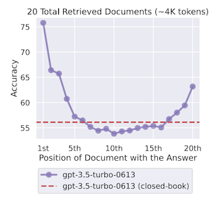 그러나 이렇게 단순히 더 많은 문서 가져오는 방법은 결과적으로 최종 응답의 품질을 개선하지 못할 확률이 높다. 최근 발표된 논문에 따르면 RAG의 정확도는 단순히 참조할 문서가 존재 하는지가 아니라, 참조 문서의 순서에 크게 영향을 받는다고 한다. 답변에 도움이 될 문서가 LLM에 참고할 문서로 전달 될 때, 해당 문서가 수많은 문서들 사이에서도 앞에 위치해야 실제 응답 결과에 도움이 된다는 것이다.