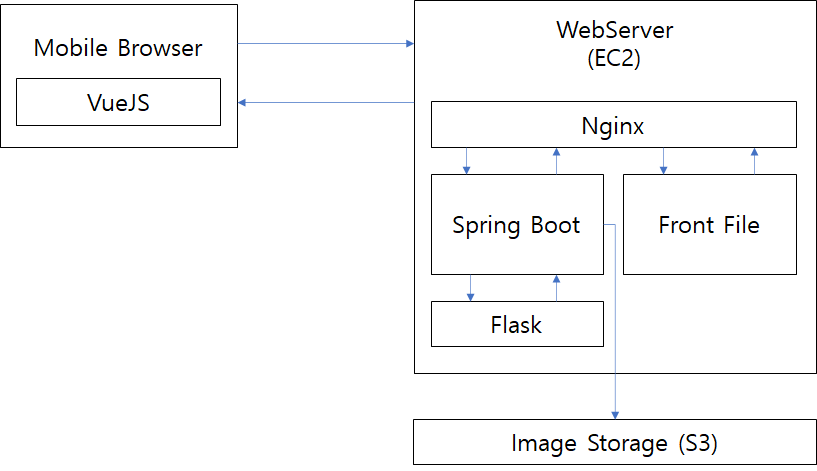 서버는 AWS EC2에서 Ubuntu Server 18.04로 인스턴스를 생성하여 사용하였다. Nginx로 요청을 받아서 프론트 파일을 반환해주거나, 스프링 부트로 보내서 응답을 전해주었다. 또 내부적으로 토끼 이미지를 분석하는 Flask기반 서비스도 있었는데 데이터 문제로 보류되어서 아쉬웠다. 그래도 응답과 함께 들어온 이미지를 S3로 보내 저장하여 훗날을 도모하였다.