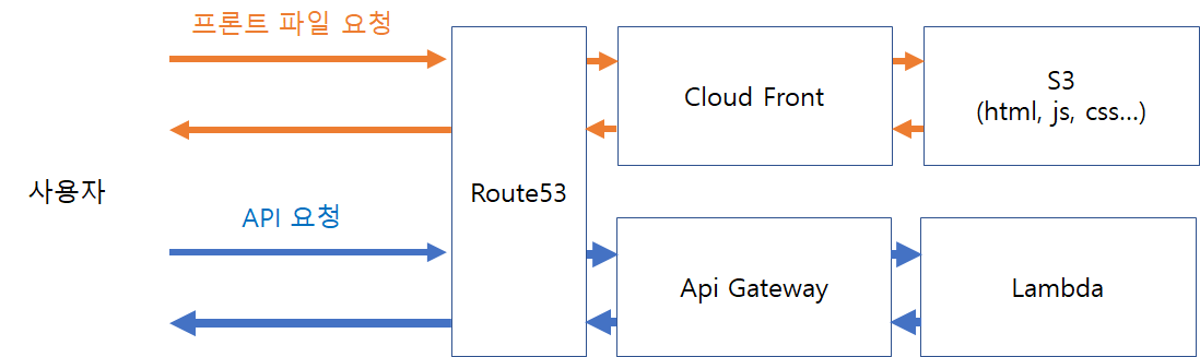 그래서 프론트는 Cloud Front와 S3를 사용하여, 사용량당 비용이 발생하도록 하였다. S3에 Vuejs 빌드 파일을 올리고 이를 Cloud Front로 배포하였다. 그리고 서버 API는 Api Gateway와 Lambda를 사용하여, 요청당 비용이 발생하도록 하였다. 기존 서버로 동작하던 API를 각각 하나의 Lambda로 분리하였고, 이를 Api Gateway로 요청이 오면 각각의 Lambda가 실행되도록 하였다. 그리고 Route53이 제일 앞에서 bbti.site 도메인으로 오는 요청을 각각에 연결한다. 기존 24시간 동작하는 서버의 고정비용이 아니라 사용에 따라 비용이 발생하도록 구조를 개선하여 비용은 1/10 가까이 줄일 수 있었다.