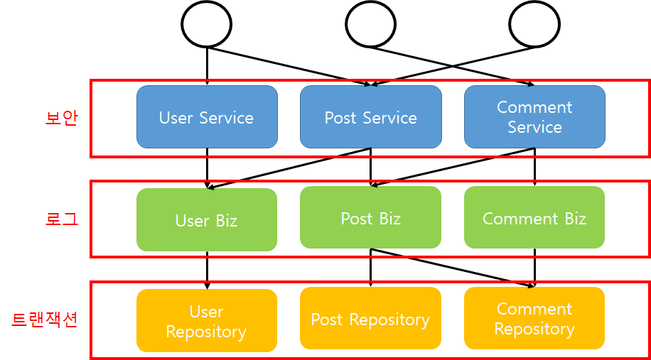 과거 프로그램의 규모가 커지면서 중복된 코드를 줄이고 유지보수성을 높이기 위해 OOP, 객체지향 프로그래밍이 등장하였다. 객체지향 프로그래밍은 각각의 역할을 분리하고 서로 필요할 기능을 호출하도록 하여 그 목표를 달성하였다. 웹서비스의 구조를 보면, 사용자 입장에서는 서로 다른 기능으로 보일지라도 여러 서비스와 레포지토리 객체를 공통으로 사용한다.