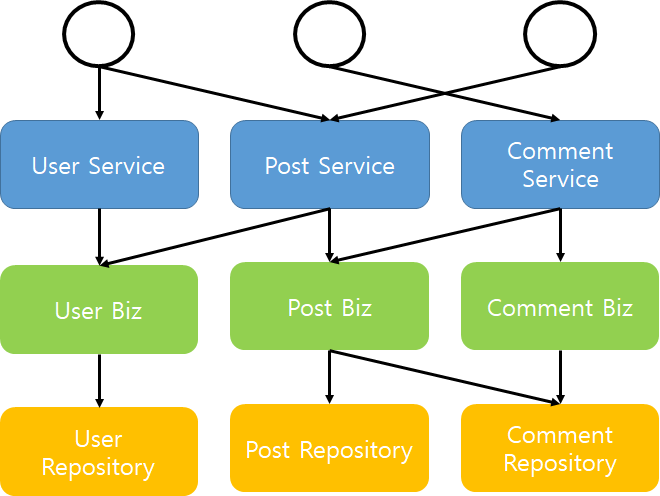 과거 프로그램의 규모가 커지면서 중복된 코드를 줄이고 유지보수성을 높이기 위해 OOP, 객체지향 프로그래밍이 등장하였다. 객체지향 프로그래밍은 각각의 역할을 분리하고 서로 필요할 기능을 호출하도록 하여 그 목표를 달성하였다. 웹서비스의 구조를 보면, 사용자 입장에서는 서로 다른 기능으로 보일지라도 여러 서비스와 레포지토리 객체를 공통으로 사용한다.
