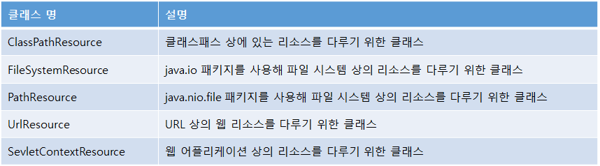 리소스 접근을 위한 Resource 추상클래스와, 각각 상황에 맞는 Resource 구현클래스들이 있다. 그리고 Resource 구현클래스들을 보다 편하게 사용하기 위한 ResourceLoader도 존재 한다. 이렇게 개발자의 수고를 덜어주는 유익한 도구들을 보면, 스프링에 대한 고마움이 저절로 강해진다.